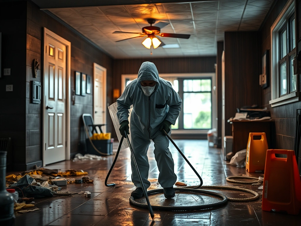 Crews start water extraction and set up HEPA filtration units. We use negative air to stop contaminants from moving around.
